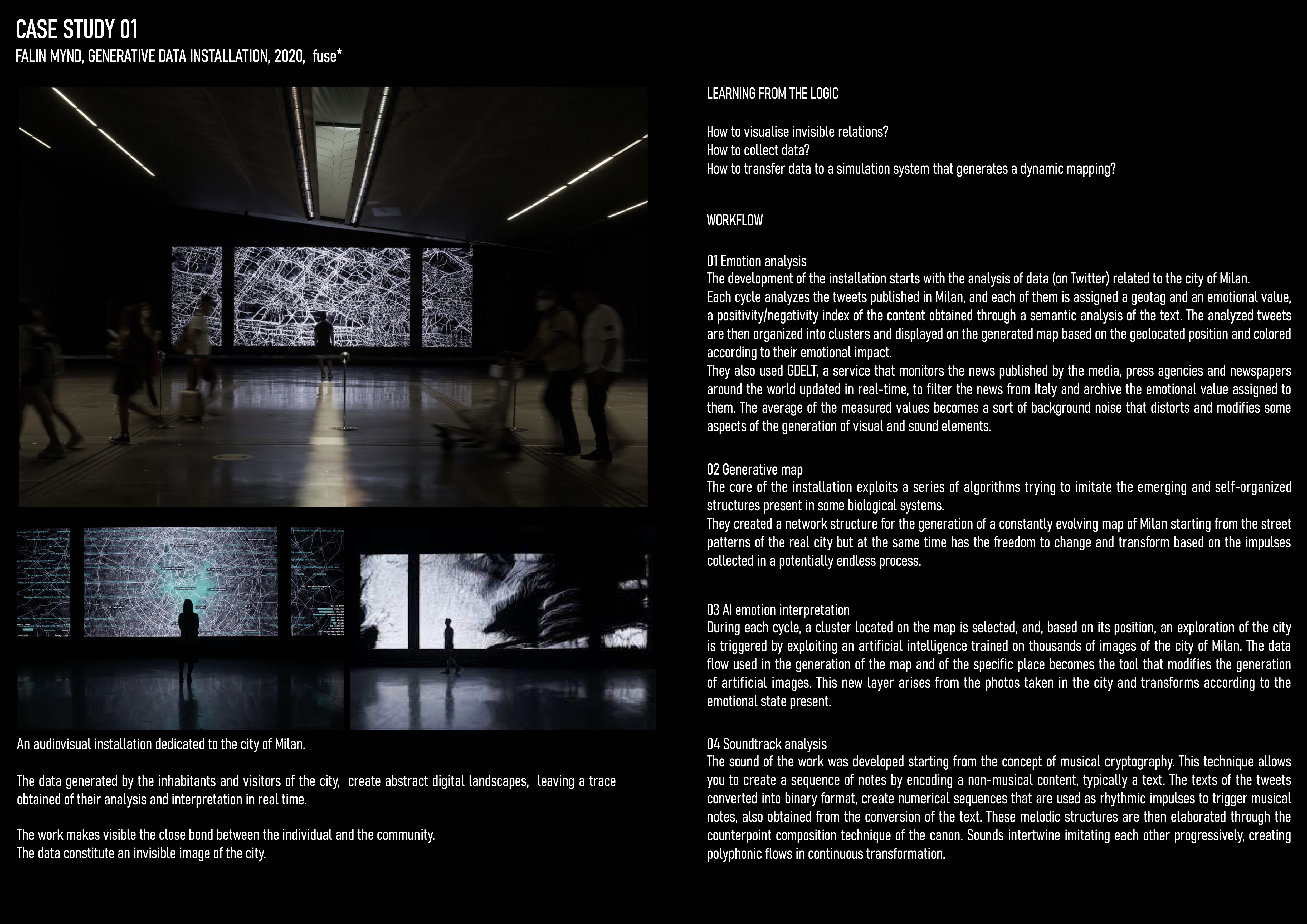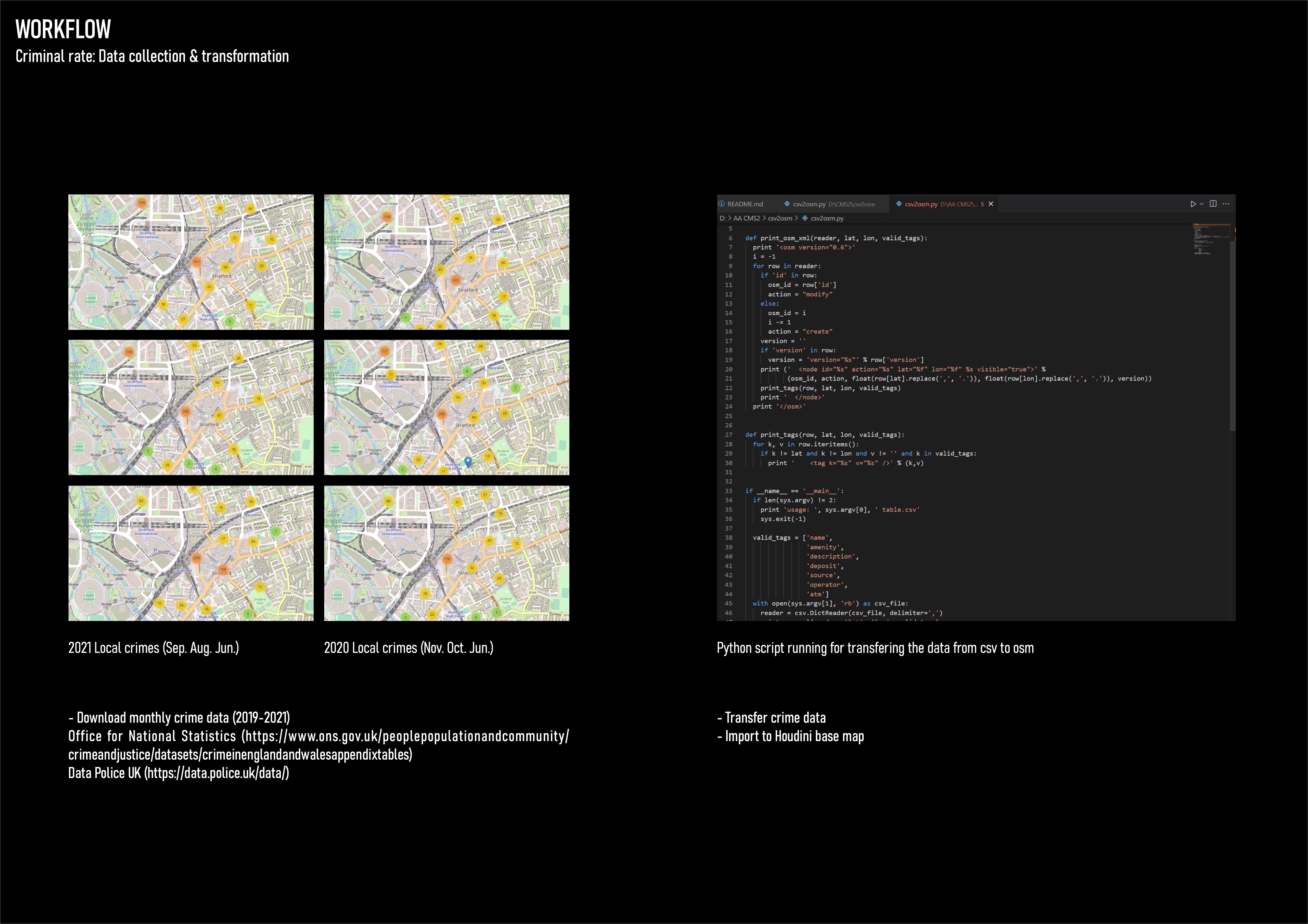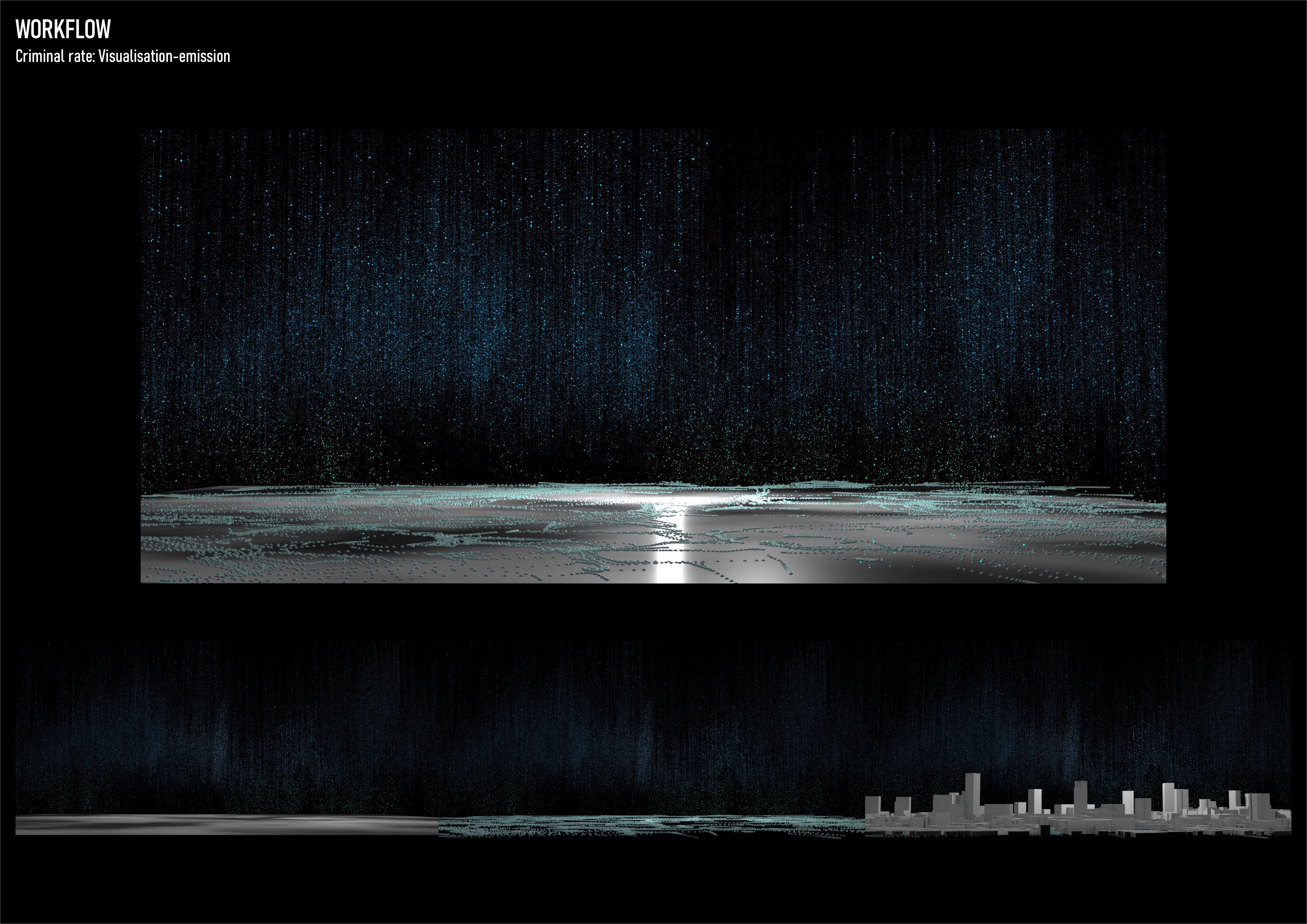 Based on how the ‘environment’ affects people’s behaviours, the project aimed to explore invisible relationships in between. The abstract digital landscape visualises how traffic flow and spatial order affect the crime rate in east London.