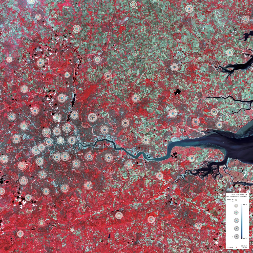 Based on land-use classification, the project analysed seven years of data to track landscape changes. Different colours represent different land use. For example, the red area represents ‘was under change’ with various actions. The second layer is the domestic migration flow from Newham. Gradual white circles (from small to large) represent the quantity percentage of migration during seven years. Incremental colour plates (from white to blue) represent the age groups (young to old).