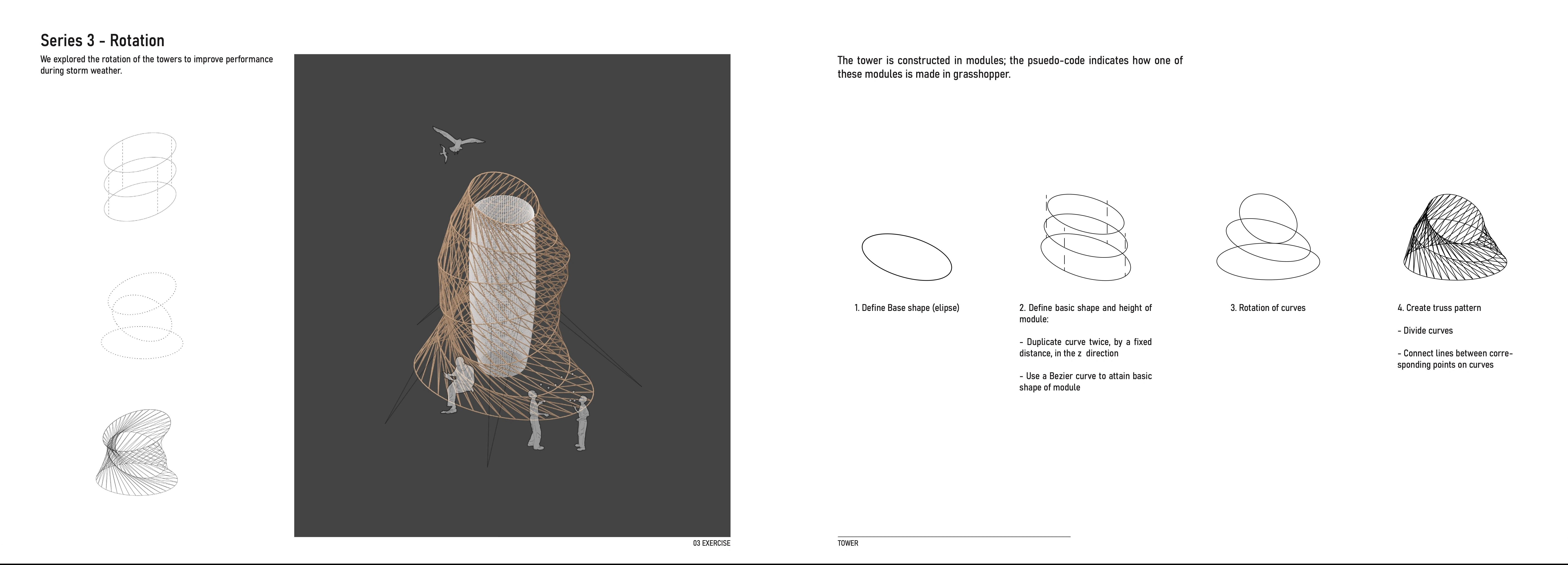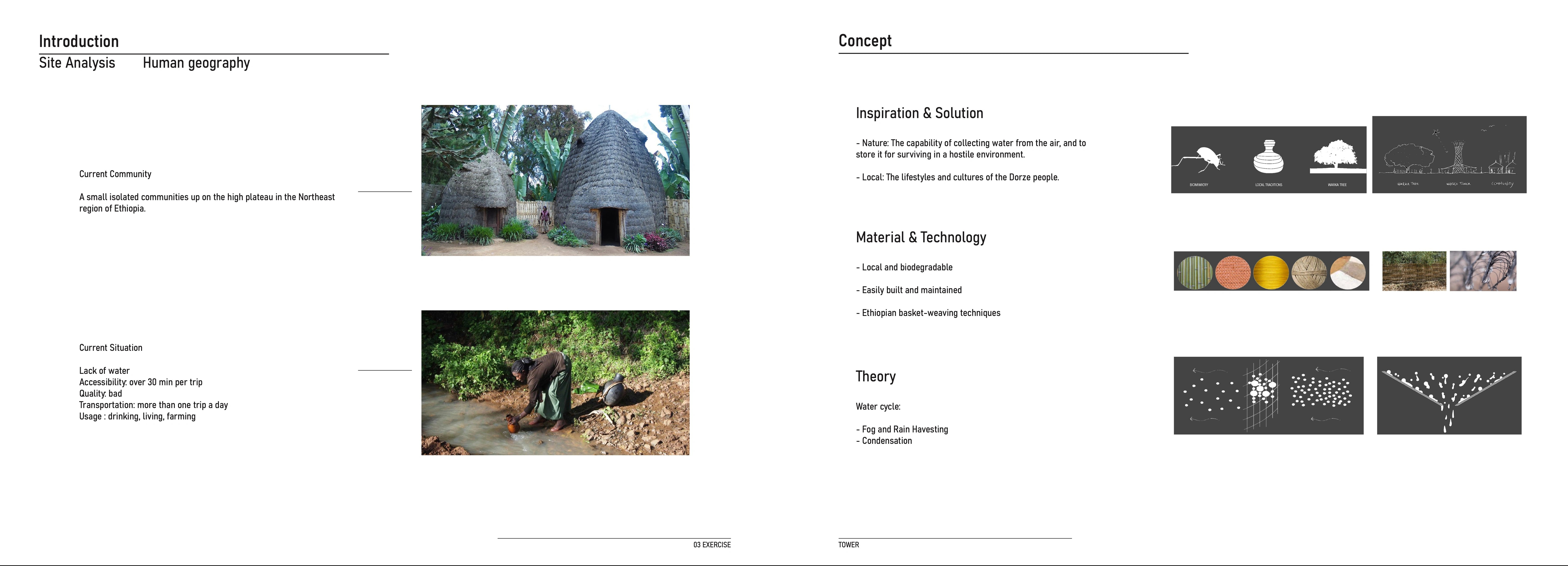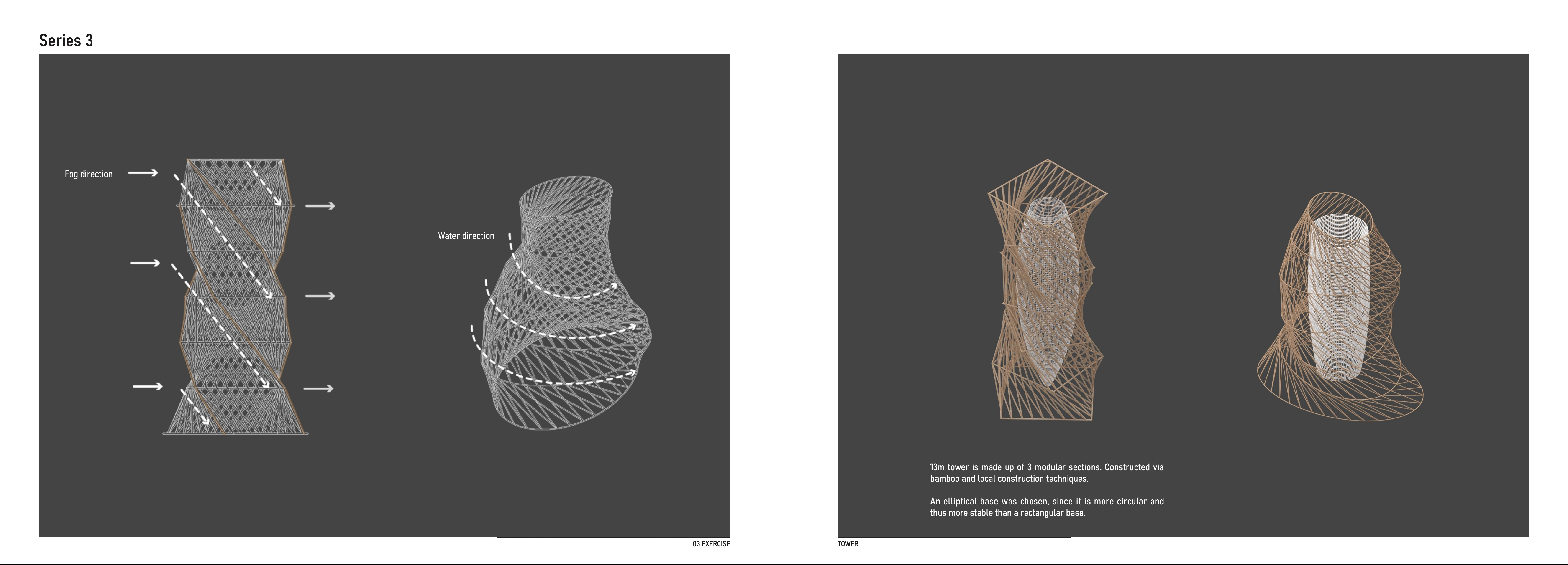 The project is based on the actual situations in Etheopia: water shortage, lousy accessibility, climate and local lifestyle. The structure is inspired by local basket weaving techniques and the water cycle theory. 13m tower is made up of 3 modular sections. Constructed via bamboo and local construction techniques. An elliptical base was chosen, since it is more circular and thus more stable than a rectangular base.